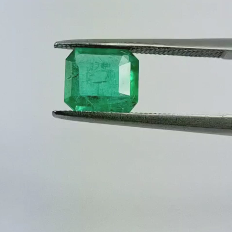 Esta esmeralda é originária do Brasil e pesa aproximadamente 1,59 quilates. Seu formato/lapidação é retangular. Esta esmeralda está disponível para encomenda e pode ser enviada para diversas partes do mundo.