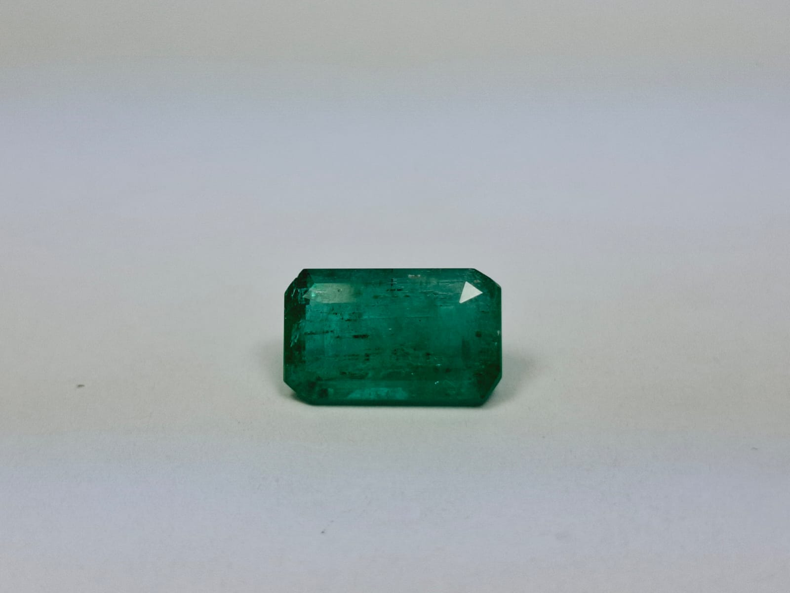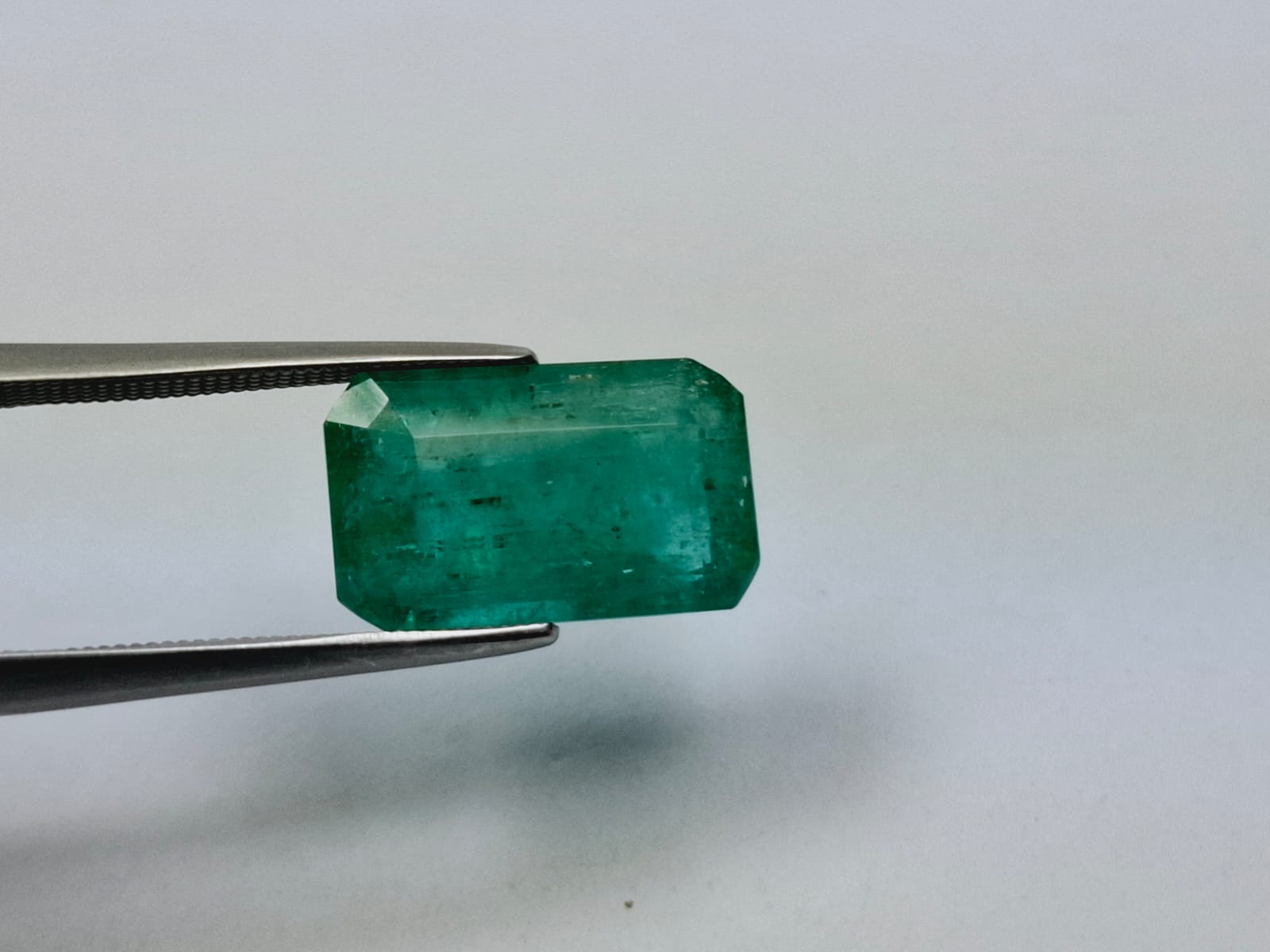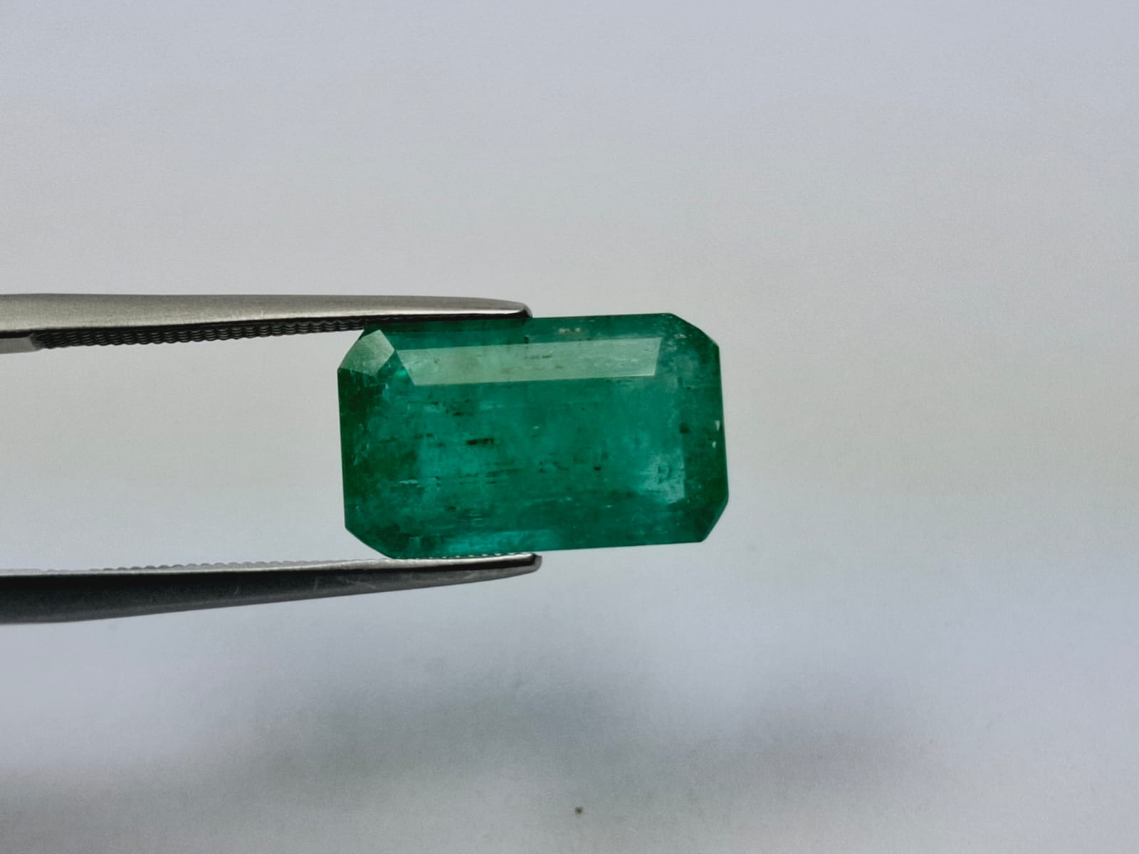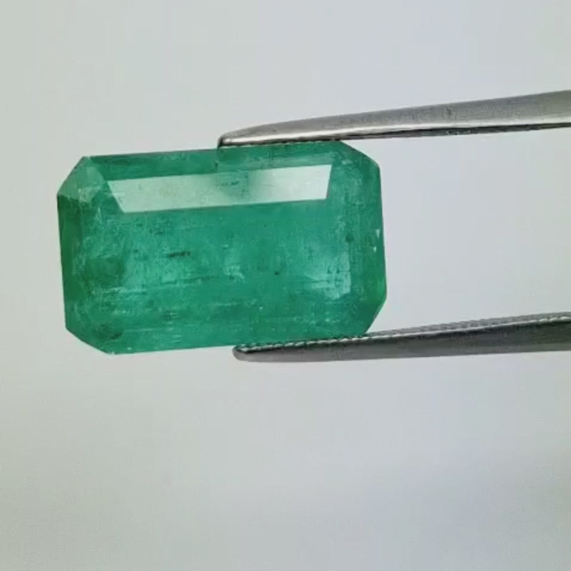 Esta esmeralda é originária do Brasil e pesa aproximadamente 5,50 quilates. Seu formato/lapidação é retangular. Esta esmeralda está disponível para encomenda e pode ser enviada para diversas partes do mundo.